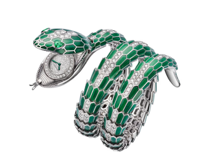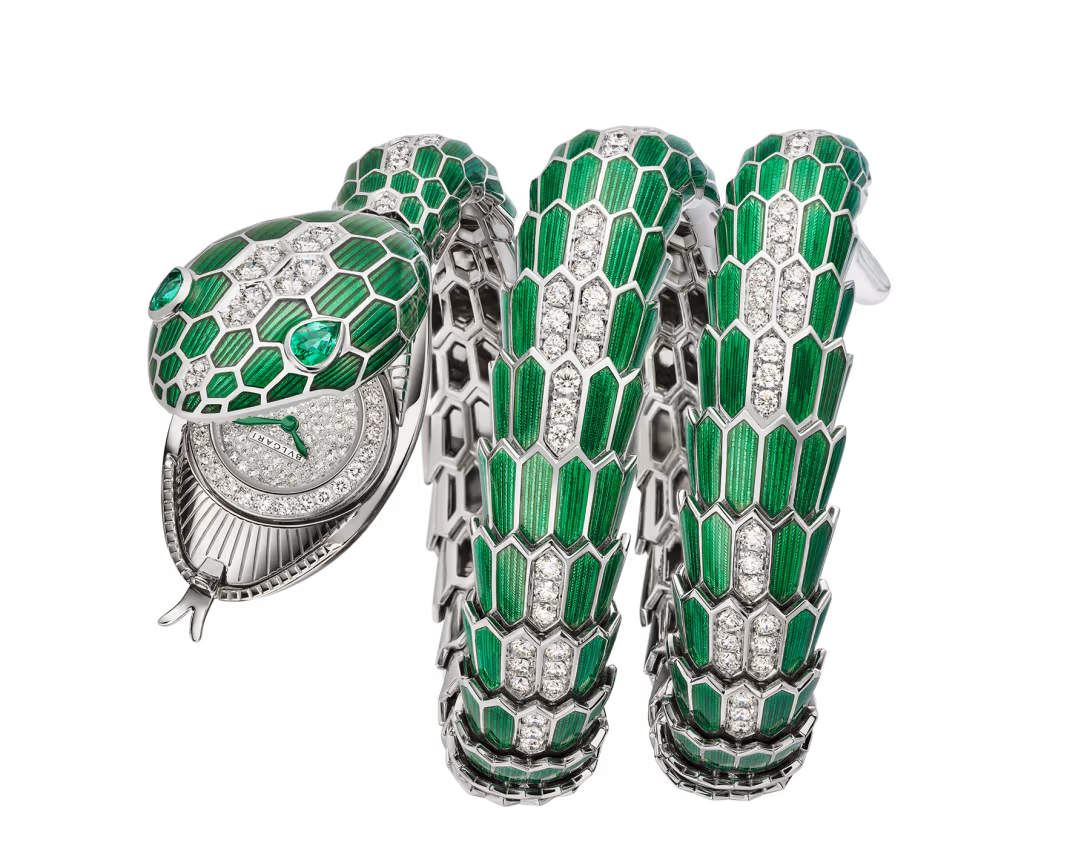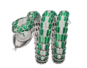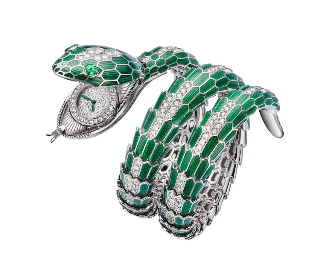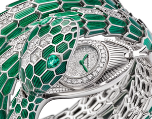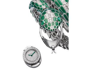 Misteriosi High Jewellery secret watch with mechanical manufacture micro-movement with manual winding, 18 kt white gold case and bracelet with green lacquer, brilliant-cut diamonds and two pear-cut emeralds, with pavé-set diamond dial.