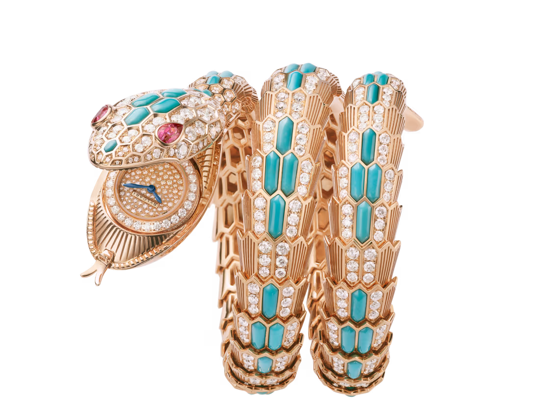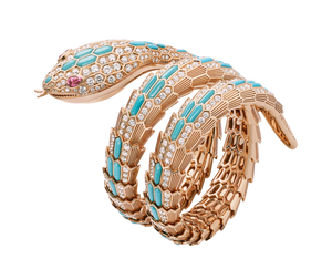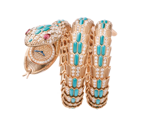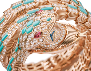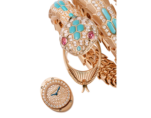 Misteriosi High Jewellery secret watch with mechanical manufacture micro-movement with manual winding, 18 kt rose gold case and bracelet set with turquoise inserts, brilliant-cut diamonds and two pear-cut rubellites, with pavé-set diamond dial.