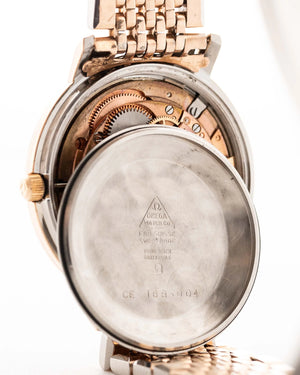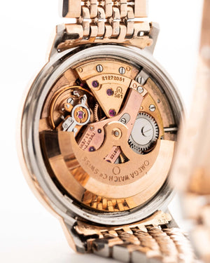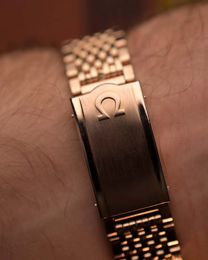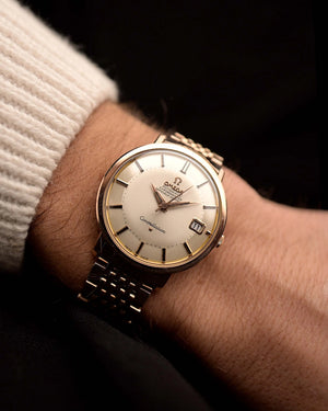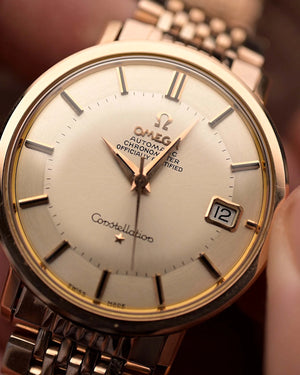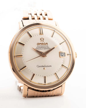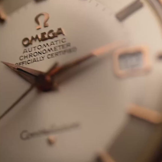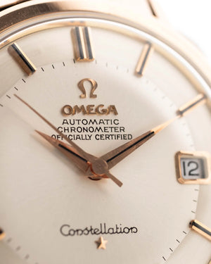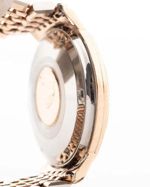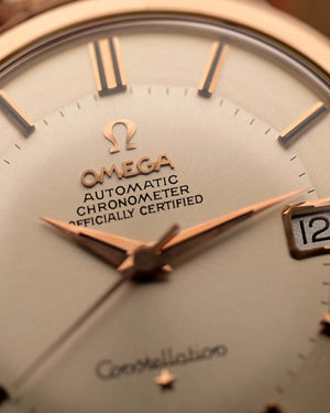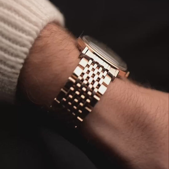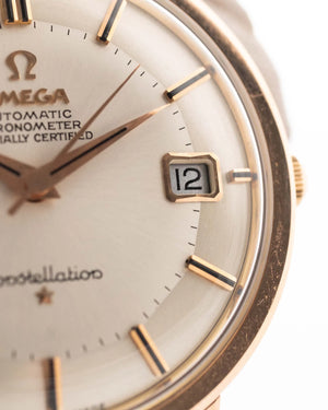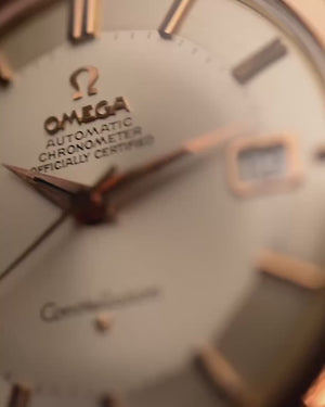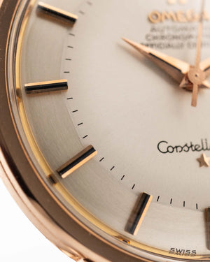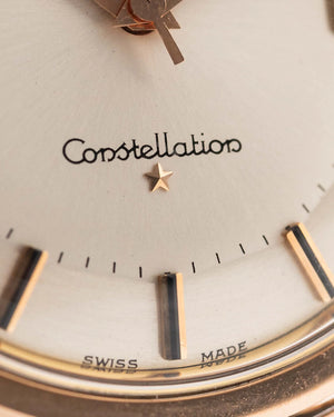 The 35.5 mm rose gold plated case displays sharp geometry and elegant contours, balanced by the signature pie pan dial in silver sunburst finish — an unmistakable hallmark of early Constellations. Slim baton indices with onyx inlay and faceted dauphine hands complete the picture, capturing the mid-century ideal of refined understatement.