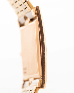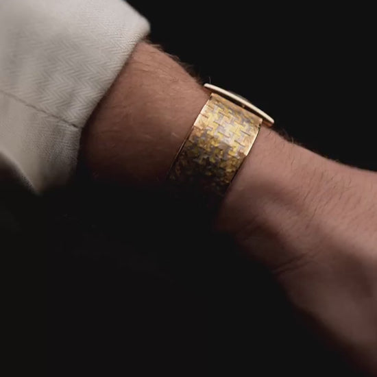 This took our breath at first sight. These geometric forms combined with the forged 18k gold bracelet, case and dial made of elements in white, yellow and rose gold are one of the rarest to find. Stick handset and hour markers with classic logo makes this piece of art complete.