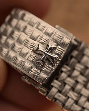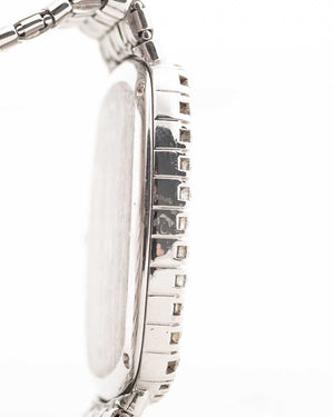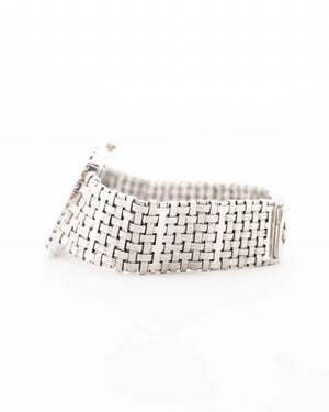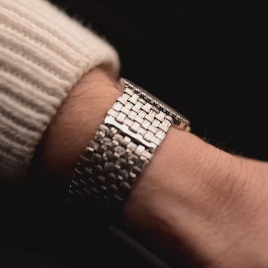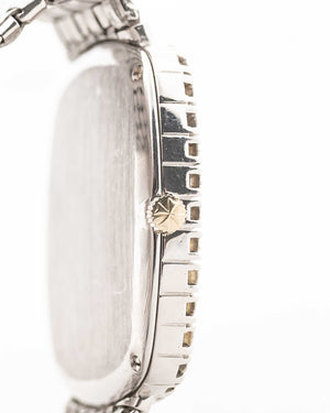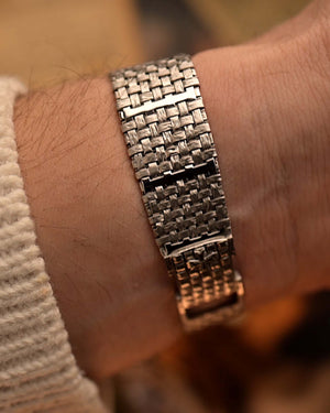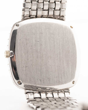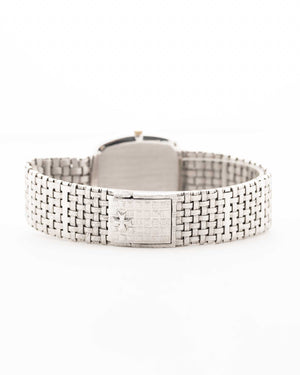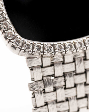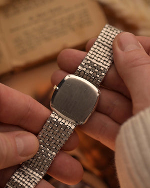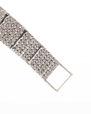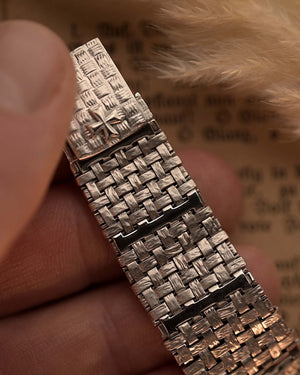 Here we have one of the rarest — possibly unique — Vacheron Constantin pieces we have ever encountered. Crafted in 18k white gold, the sharply preserved 30 mm case is paired with an integrated basket-weave white gold bracelet, giving the watch extraordinary texture and presence.